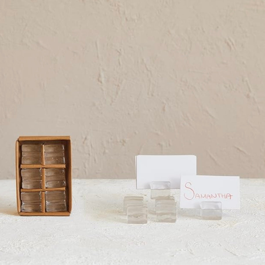 Add a touch of sophistication to your table setting with our Glass Photo and Card Holders, available in a set of six. Perfectly versatile for farmhouse, French country, coastal, or traditional decor styles, these holders seamlessly enhance any event or everyday decor. Each holder is crafted from transparent glass, reflecting light beautifully and complementing any color scheme effortlessly.