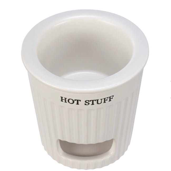 Keep your dips warm and stylish with the Hot Stuff Dip Warmer, a charming two-piece stoneware set designed for both functionality and farmhouse aesthetics. Featuring a ribbed white base with an opening for a tea light and a removable dip dish, this warmer ensures your favorite dips stay perfectly warm for any gathering. Accented with "Hot Stuff" in slate gray text, it seamlessly complements a rustic or modern farmhouse decor. Microwave, oven, dishwasher, and food safe, this piece is as practical as it is beautiful, making it an ideal addition to your kitchen or a thoughtful gift for a host.