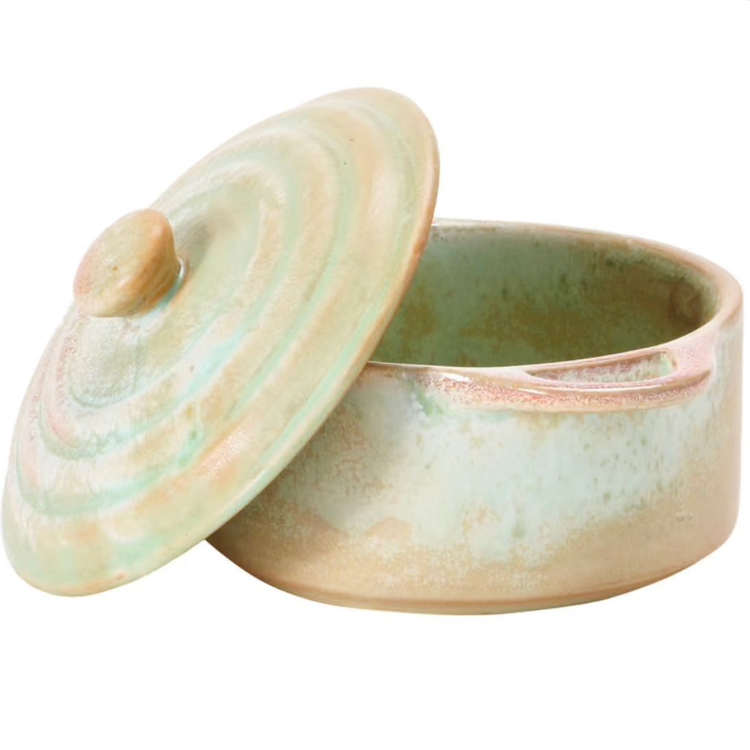 Bring timeless charm to your kitchen with this Traditional Stoneware Mini Baker, crafted with a unique reactive glaze in a soothing matte celadon hue. Measuring 5" round x 3"H, this 1-cup capacity baker is perfect for single-serve dishes, sides, or desserts. Its one-of-a-kind glaze ensures every piece is unique, making it as distinctive as your culinary creations. Complete with a matching lid to retain heat and moisture, this food-safe mini baker effortlessly combines functionality and elegance for everyday use or special occasions.