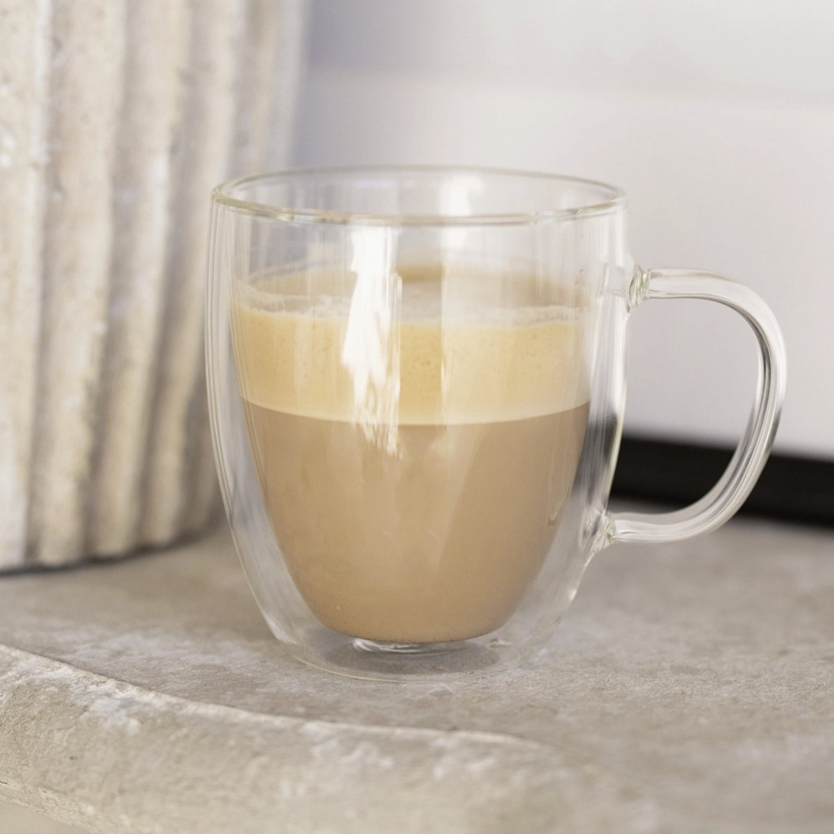 Enjoy your favorite coffee in style with the Kaffe 16oz Glass Coffee Mug. Designed with a double-wall borosilicate glass, this mug offers superior heat retention while maintaining a sleek, modern aesthetic. The insulated design keeps beverages hot or cold longer while ensuring a comfortable grip. Made from tempered, crack-resistant glass, it’s both durable and lightweight, perfect for daily use. Ideal for coffee lovers who appreciate form and function in one elegant mug.